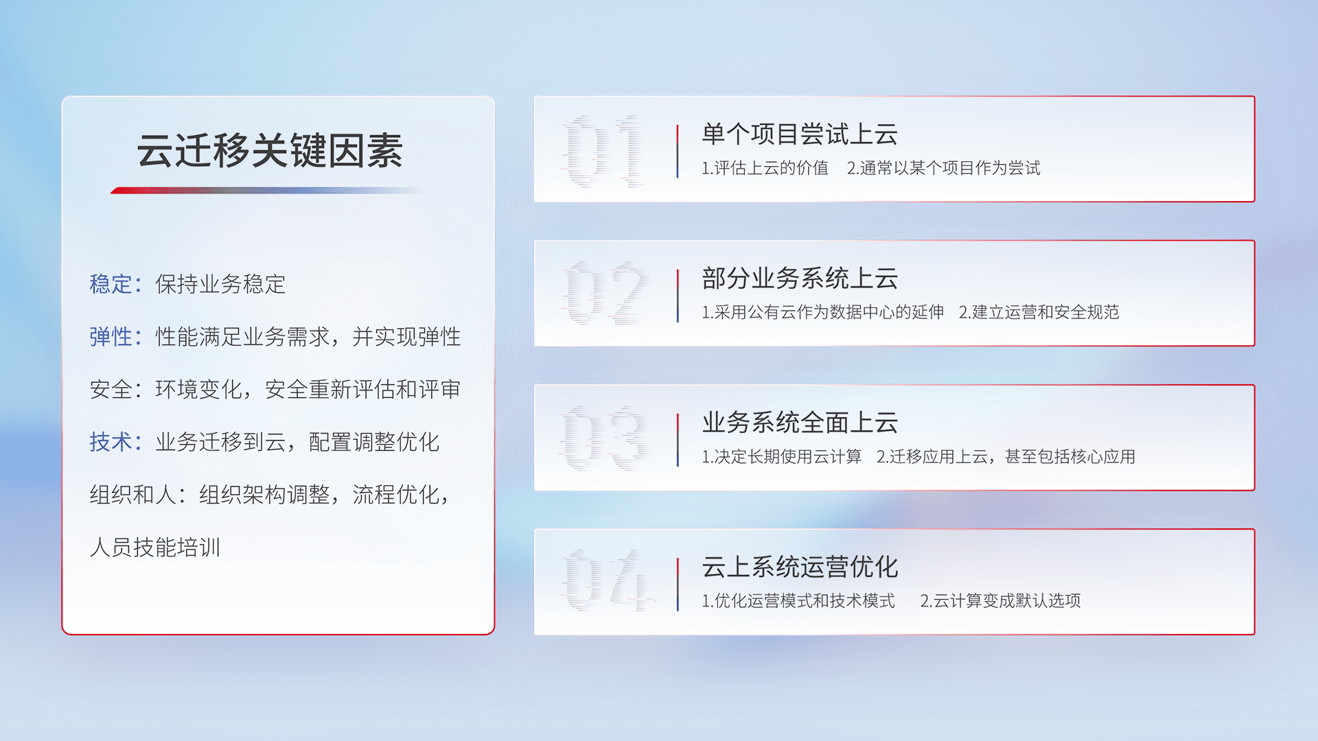 结合实际业务,,,,从规划设计、、、、云平台选型、、、云原生改造、、、、数据迁移、、、集成交付,,迁移全过程为客户识别最佳上云路径,,,做好风险识别管理,,,设计网络架构、、、、身份权限、、安全审计合规、、、、操作审计、、日志审计、、监控告警策略、、多站点容灾设计等,,,,对云上基础设施进行整体规划,,,提升IT治理水平,,以满足弹性、、、、高可用、、、、高性能的需求。。。